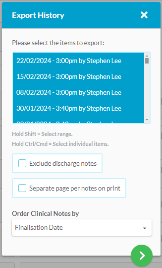 Go into Nookal and export the clinical notes and print them as a pdf.